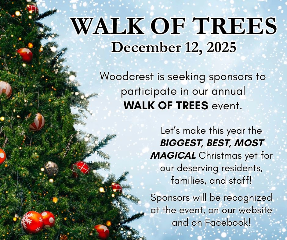 Woodcrest is seeking sponsors to participate in our annual WALK OF TREES event. We invite local businesses, organizations, and members of the community to put up and decorate a tree at Woodcrest for our residents, families, and staff to enjoy throughout the holiday season.